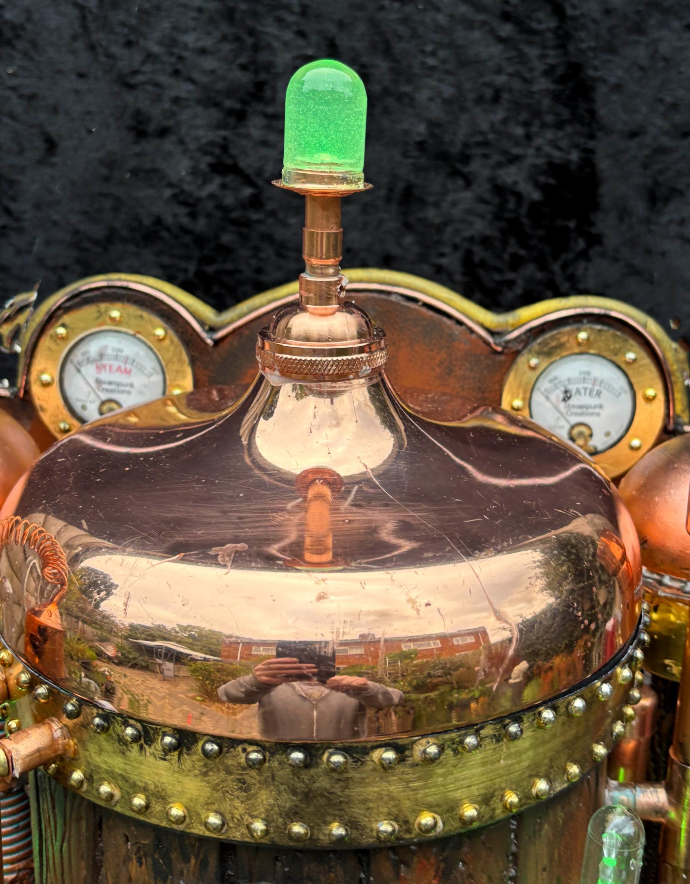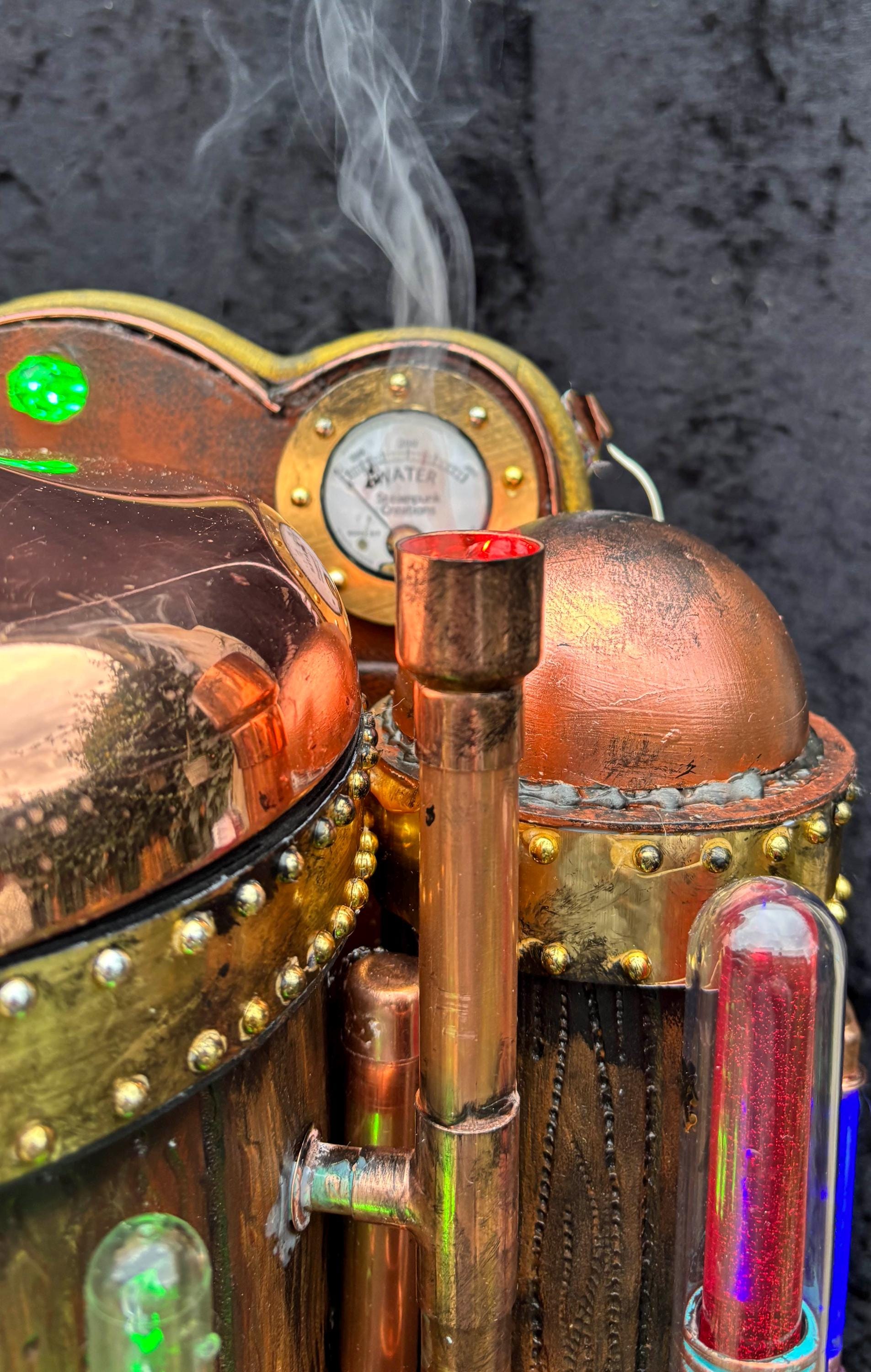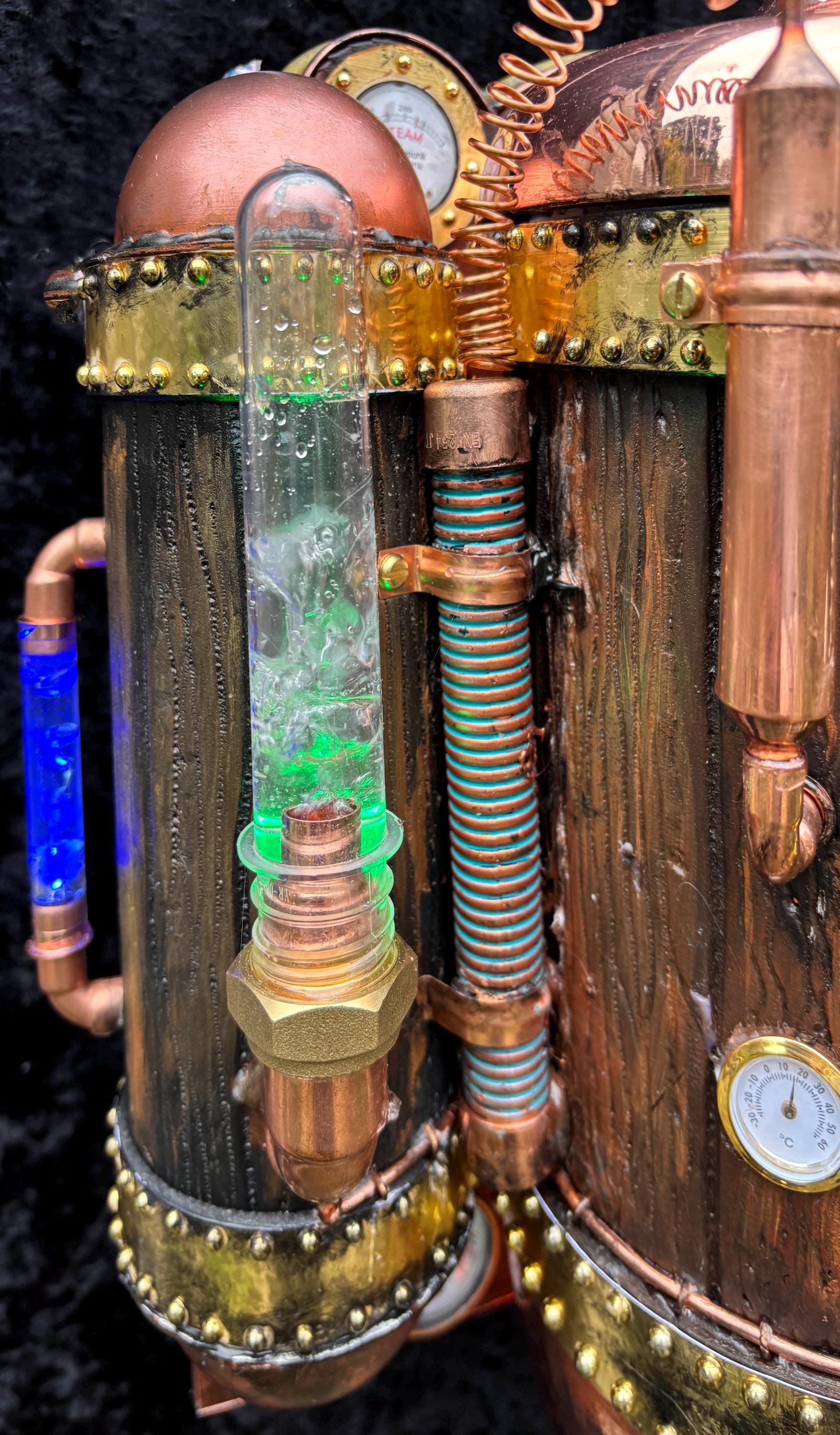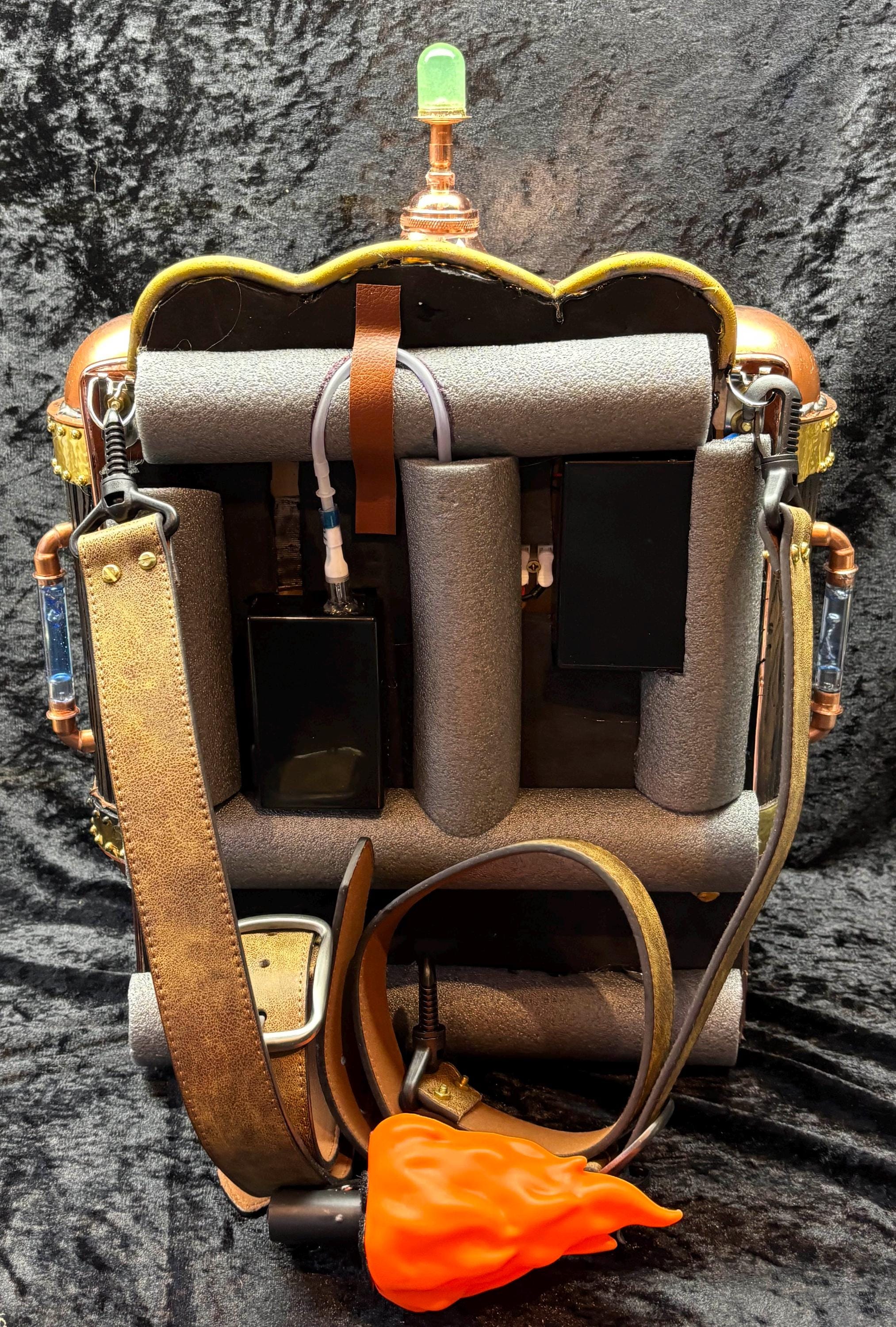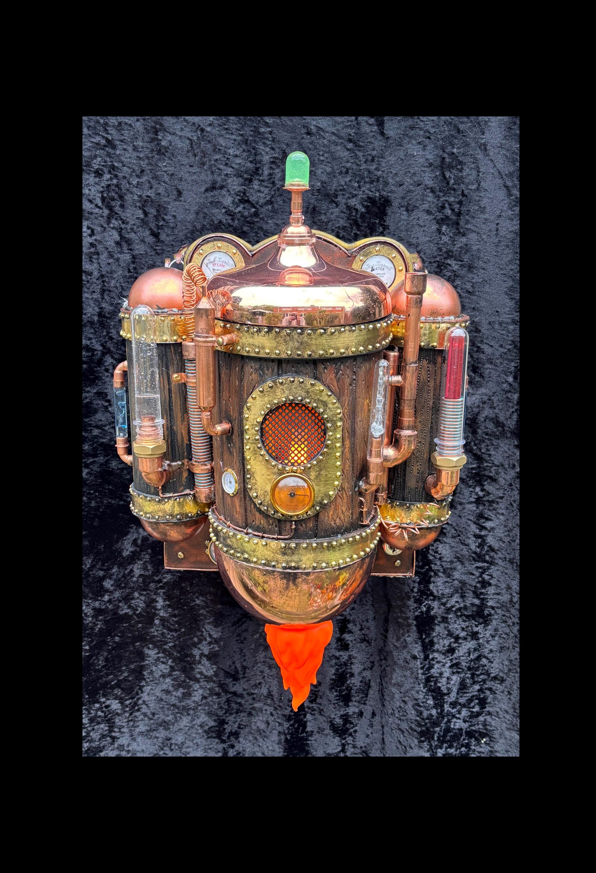 Steampunk Jetpack made from new and recycled materials. comes with detatchable smoke machine, working bubble tube, detachable flickering flame, resin water tubes, reactor core, LEDs .Detachable real leather straps.Copper chimney, Wight is 3.5 kgs width 40 cms hight with flame attached is 56 cms. looks amazing all lite up and would go well with any steampunk costume.