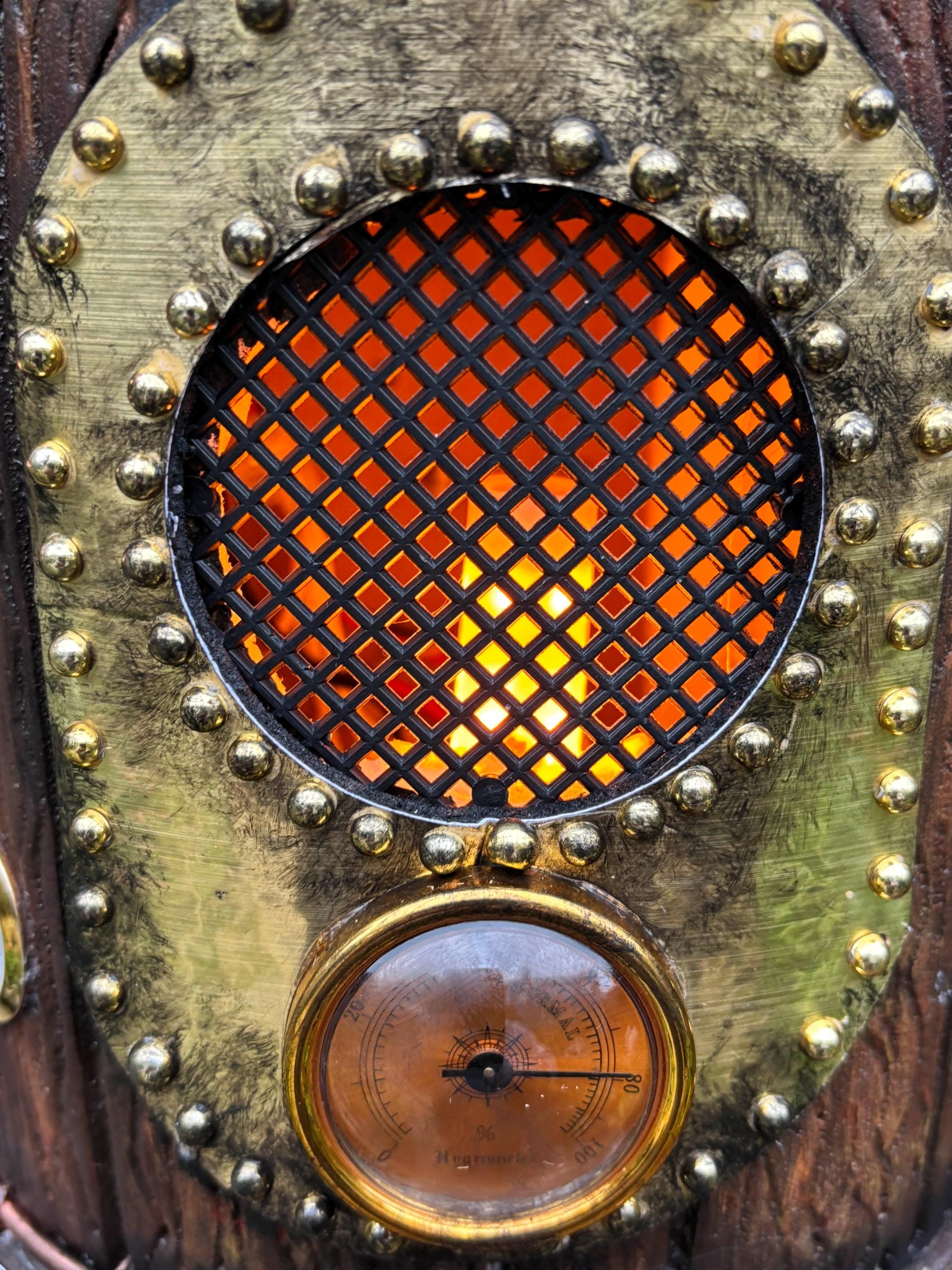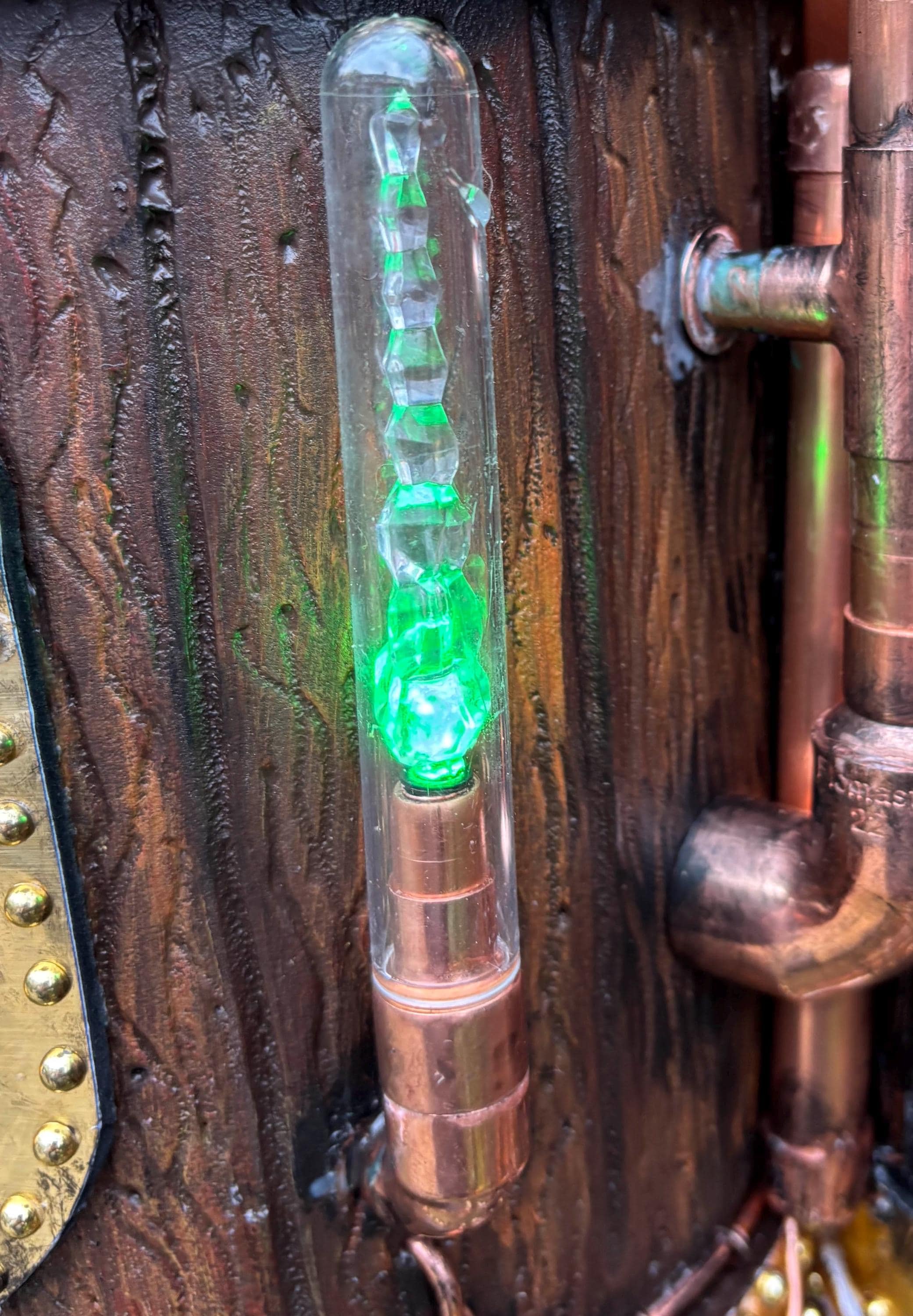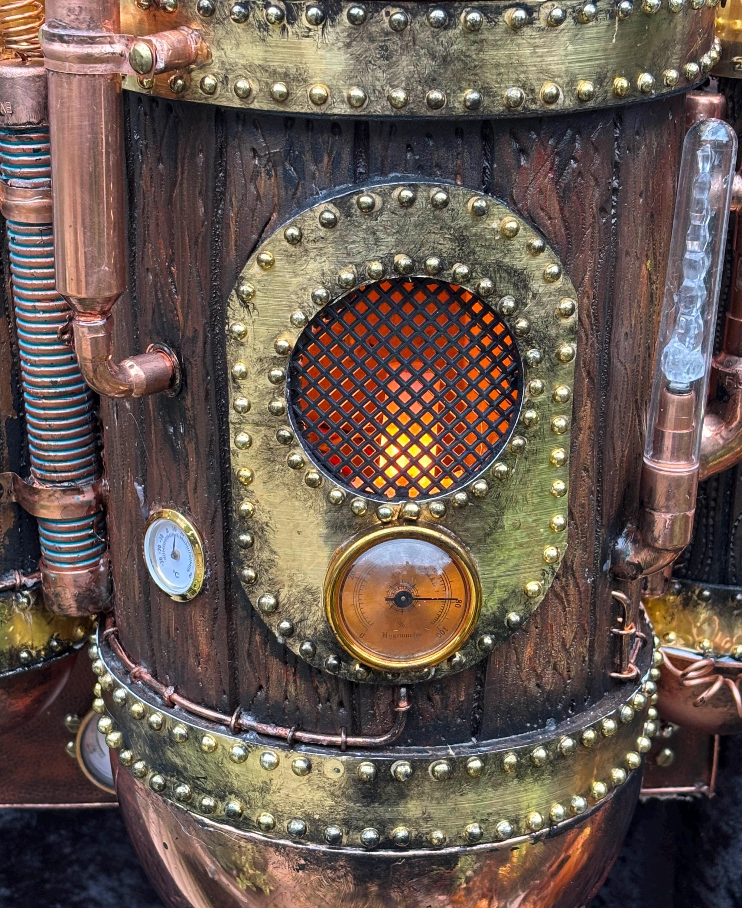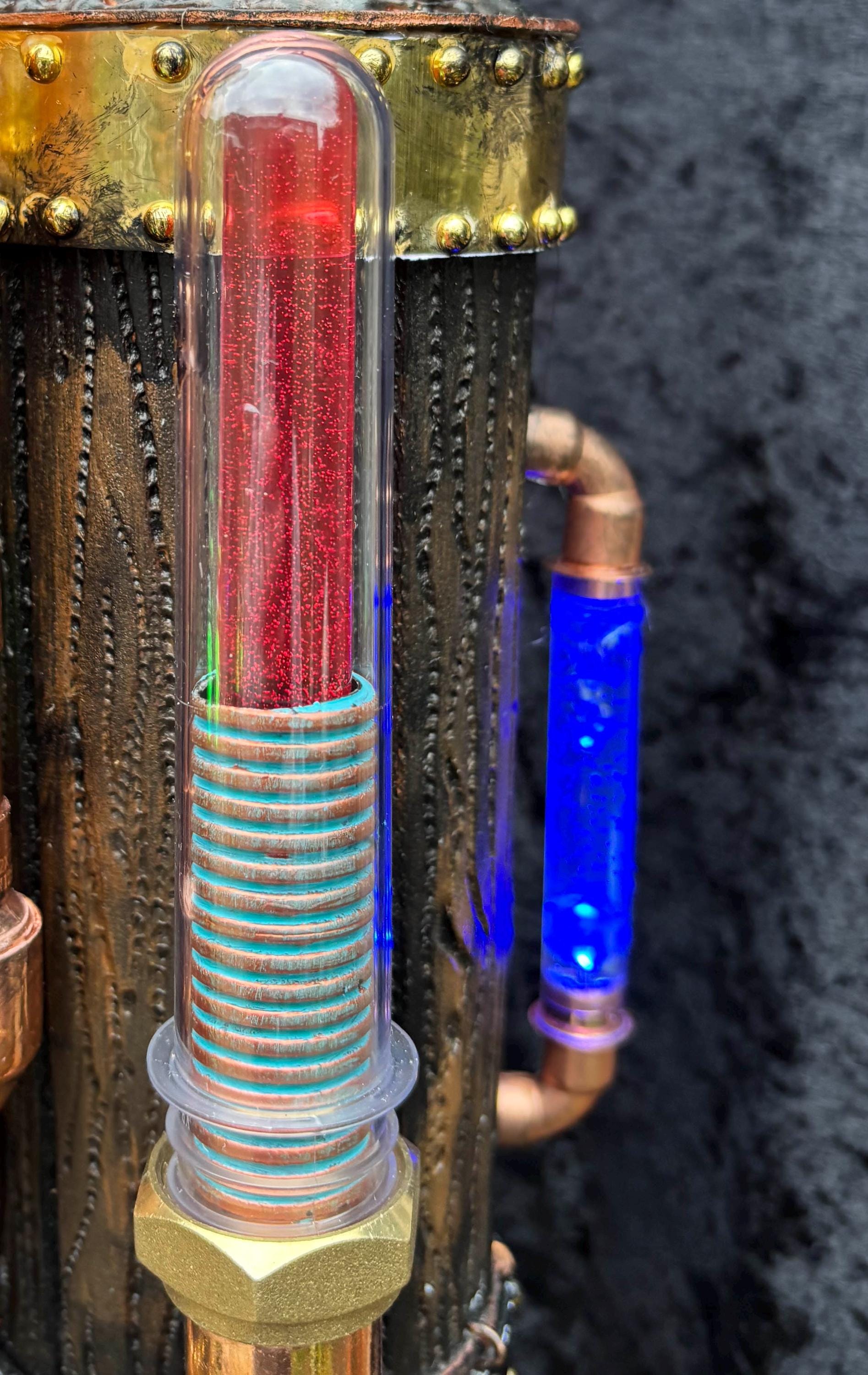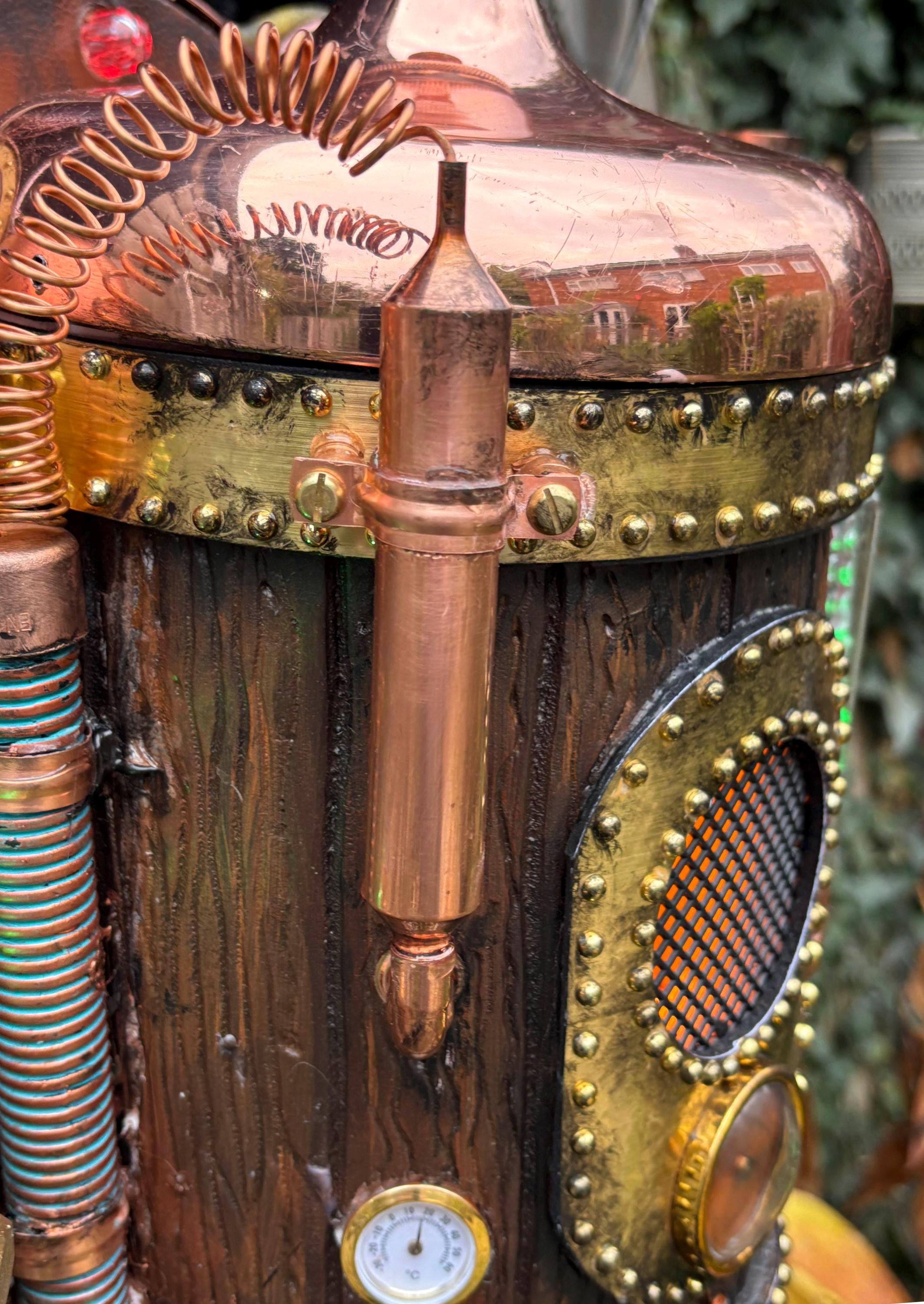 Steampunk Jetpack made from new and recycled materials. comes with detatchable smoke machine, working bubble tube, detachable flickering flame, resin water tubes, reactor core, LEDs .Detachable real leather straps.Copper chimney, Wight is 3.5 kgs width 40 cms hight with flame attached is 56 cms. looks amazing all lite up and would go well with any steampunk costume.